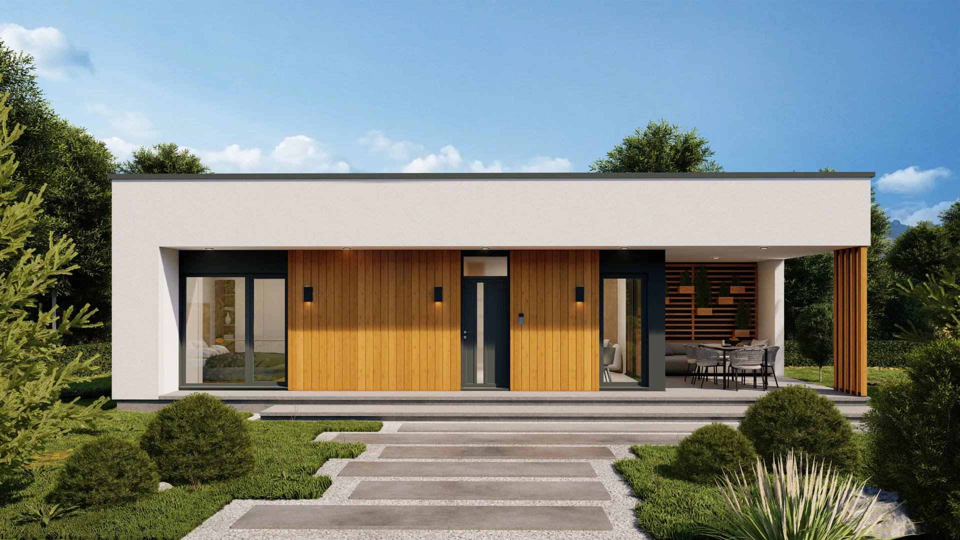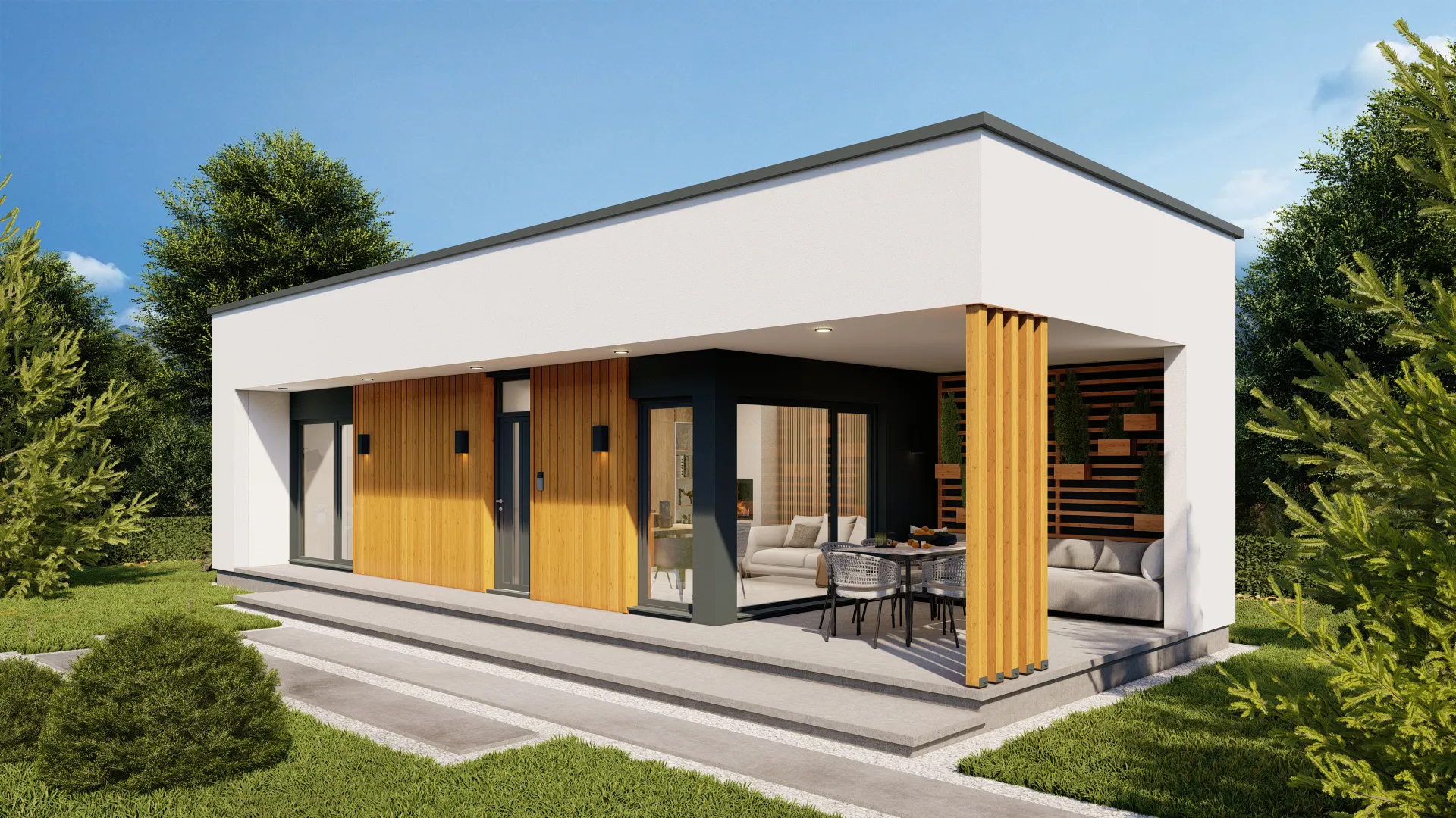 Haus Brayo besticht durch seine kompakte Größe und die große Terrasse, die den Wohnraum ins Freie erweitert. Das Flachdach verleiht dem Haus eine moderne, klare Linienführung. Perfekt für alle, die ein kleines, gemütliches Zuhause mit viel Außenbereich suchen – ideal, um die Natur zu genießen und Ruhe zu finden.