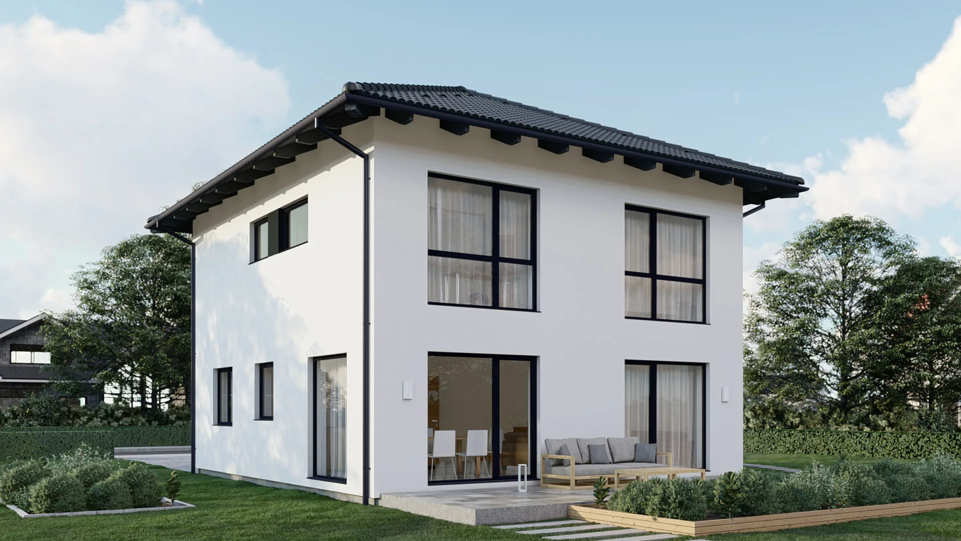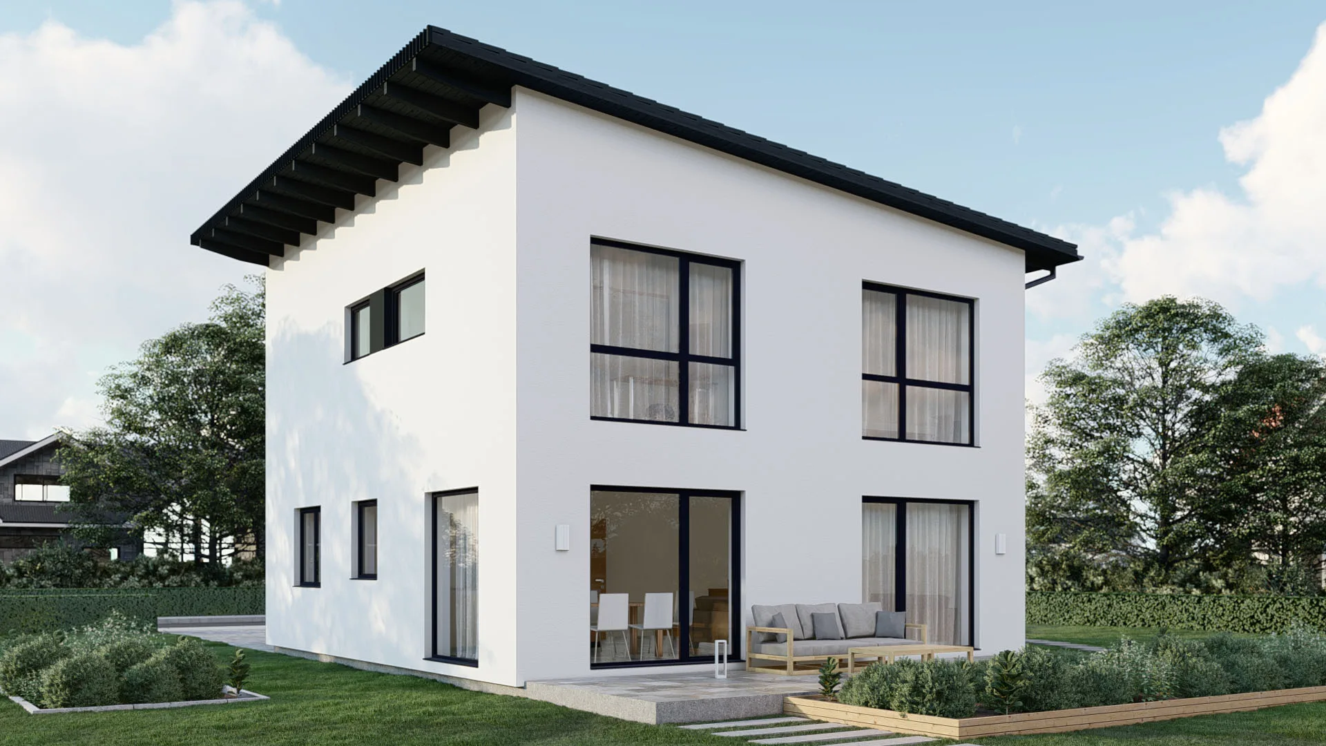 Modernes Familienhaus mit 173,8 m², 2 Etagen und flachem Flachdach (22° Neigung) – perfekt für Liebhaber klarer Linien und offener Wohnkonzepte.