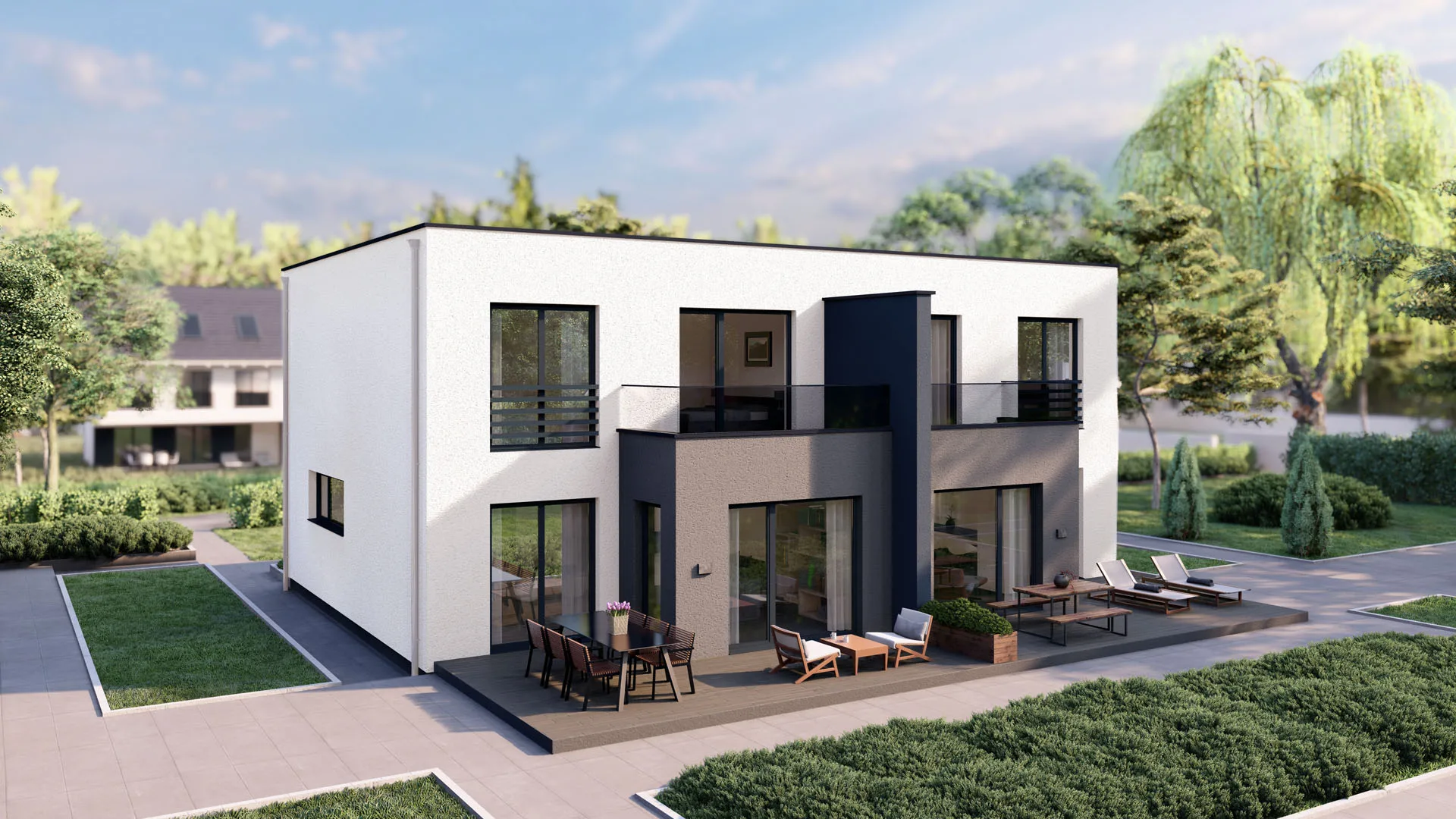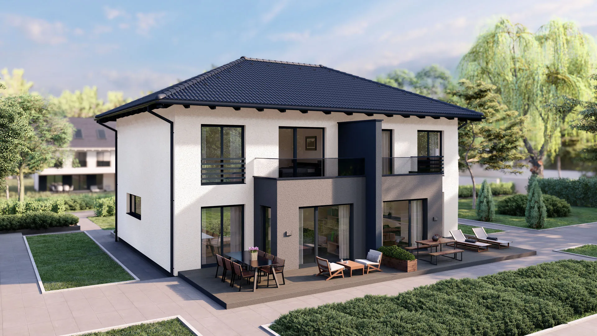Haus Dua vereint traditionellen Charme mit moderner Raumgestaltung. Die großzügige Terrasse erweitert den Wohnraum ins Freie und lädt zu geselligen Stunden ein. Dieses Haus ist perfekt für Familien, die Komfort und elegante Architektur schätzen.