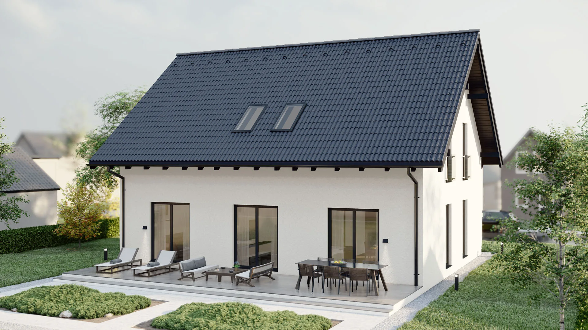 Stilvolles Familienhaus mit 230,7 m², 1,5 Etagen, klassischem Satteldach (40° Neigung) und kleiner Terrasse (2,77 m²) – ideal für Familien, die traditionelle Eleganz mit modernem Komfort verbinden.