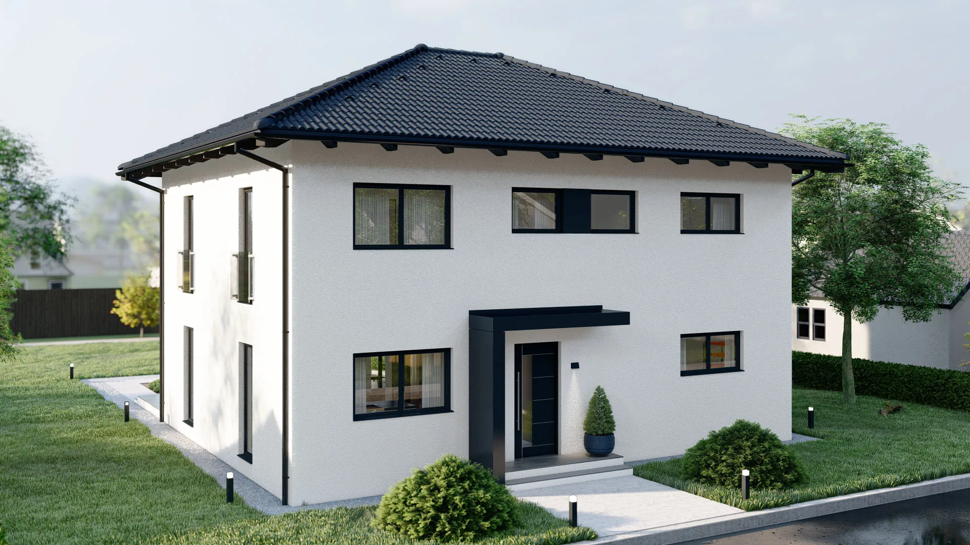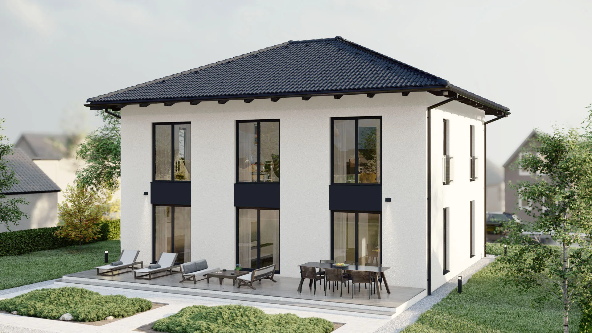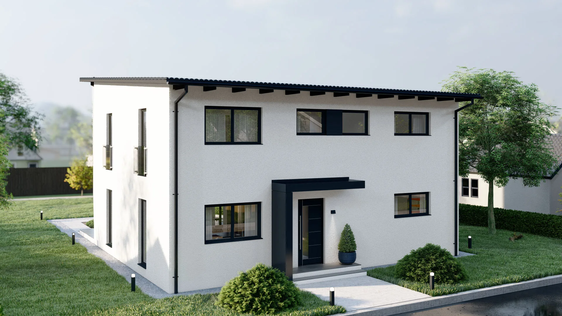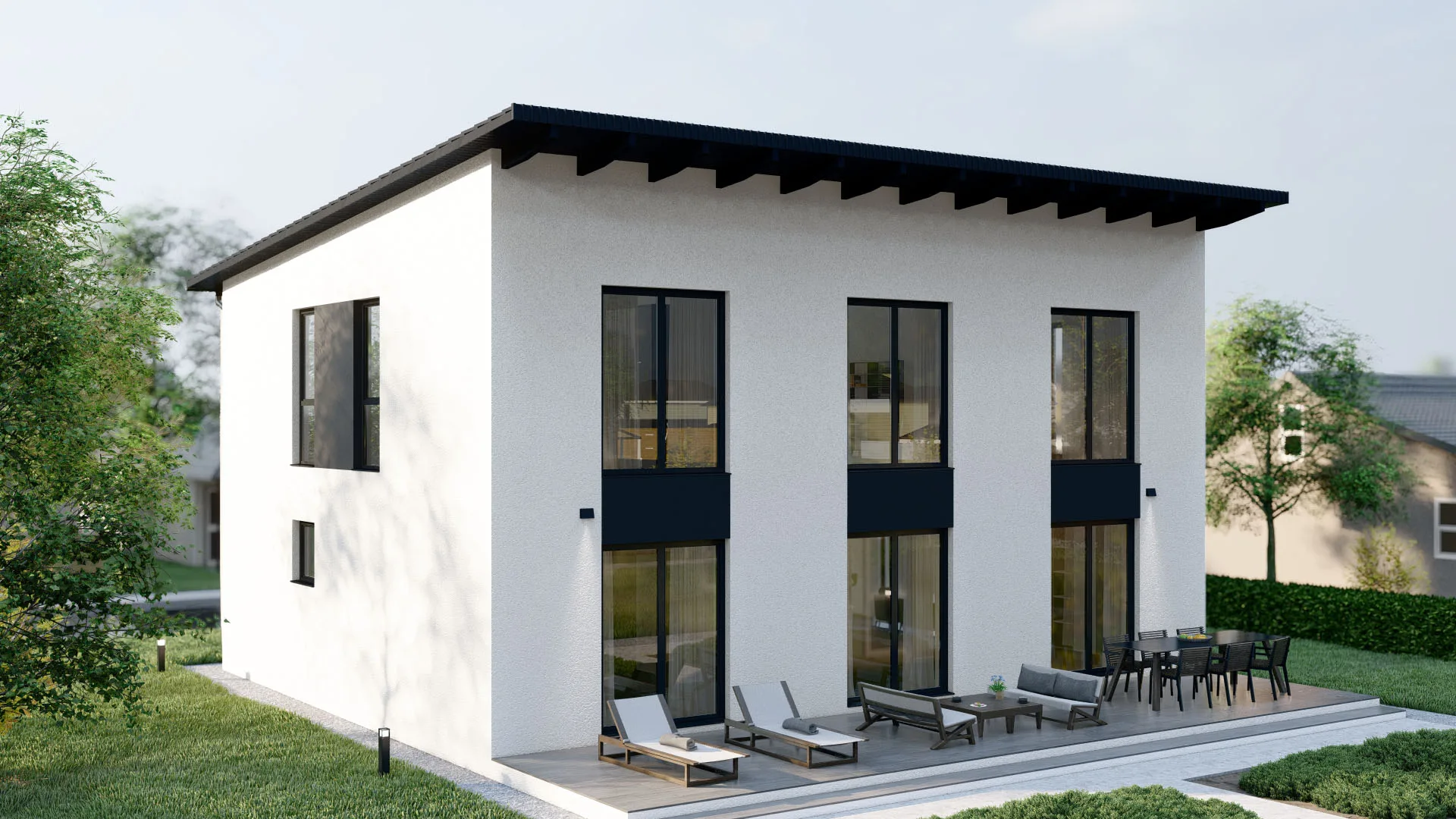 Modernes Fertighaus mit weißer Fassade und großen Fenstern - BAUTENT Hausbau und Sanierung