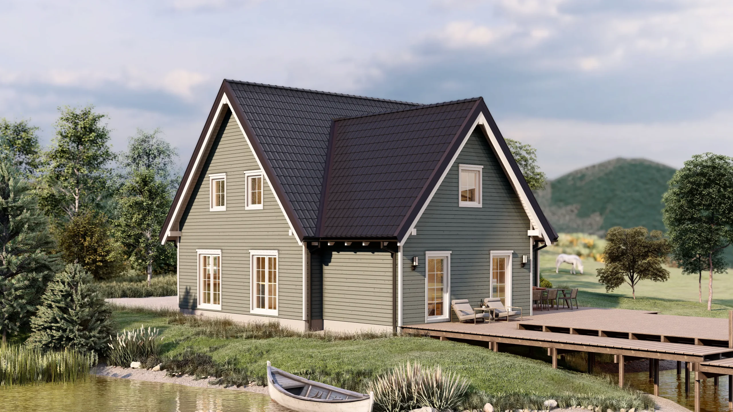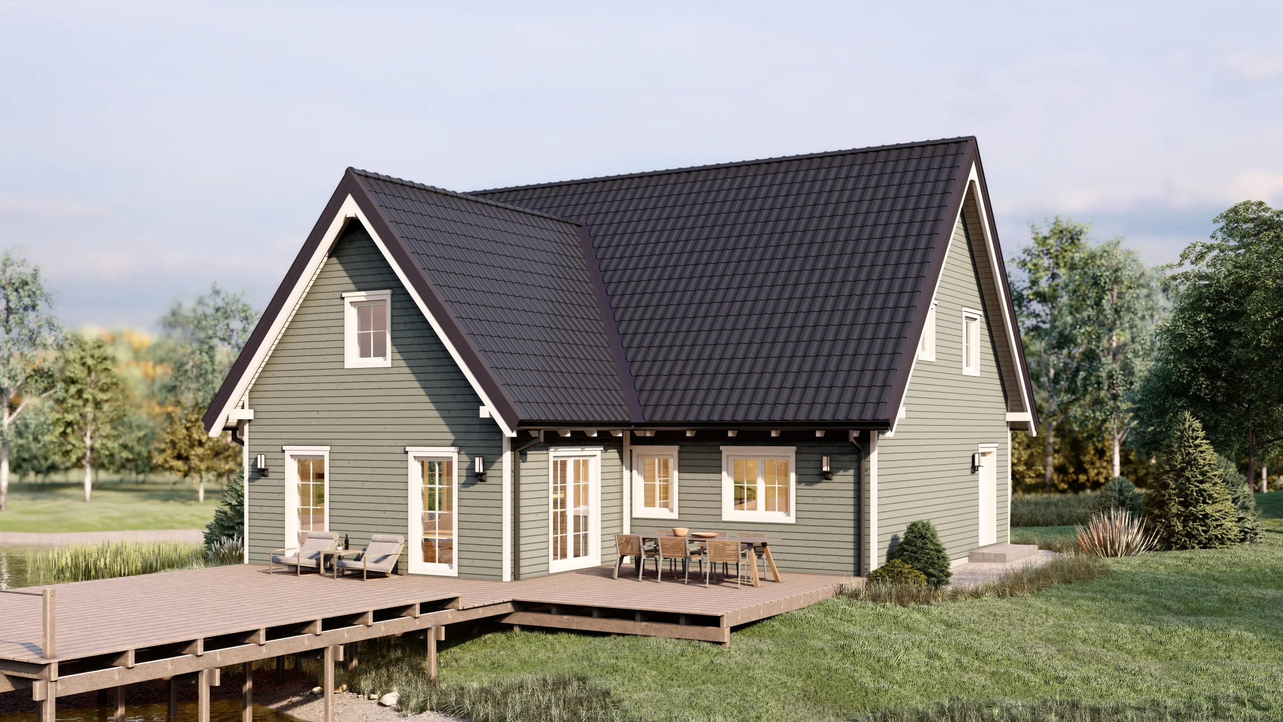 Haus Lakewood besticht durch seine großzügige Raumaufteilung und die elegante Dachform. Das Satteldach sorgt für eine behagliche Atmosphäre, während die Terrasse zum Entspannen im Freien einlädt. Perfekt für Familien, die ein stilvolles und geräumiges Zuhause mit moderner Ausstattung möchten.