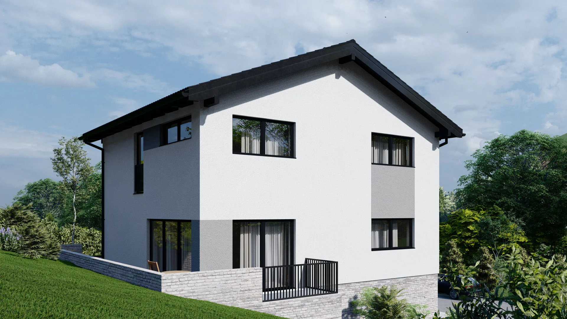Modernes Fertighaus A001 mit großen Fensterfronten und zeitgemäßer Architektur von BAUTENT
