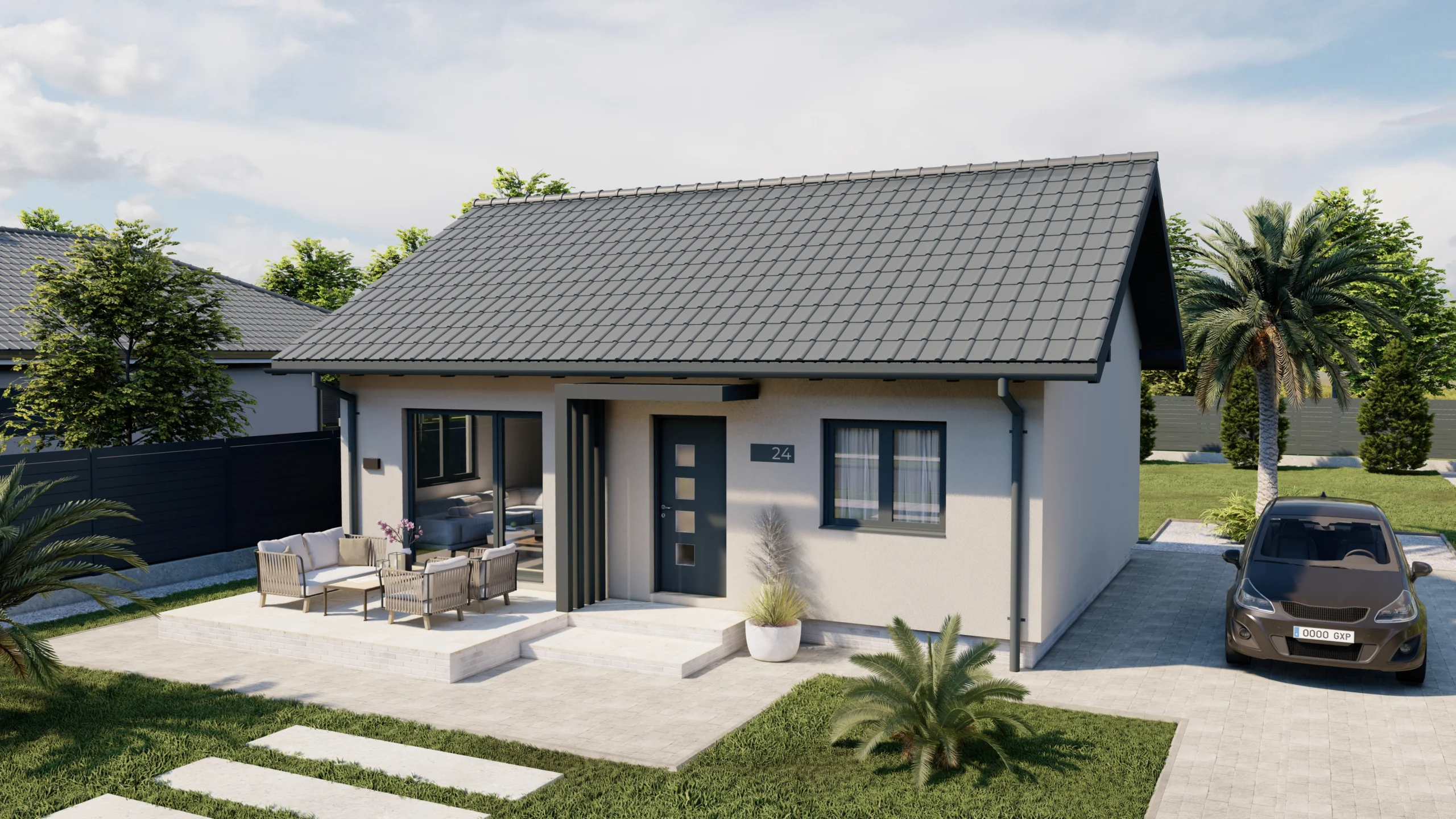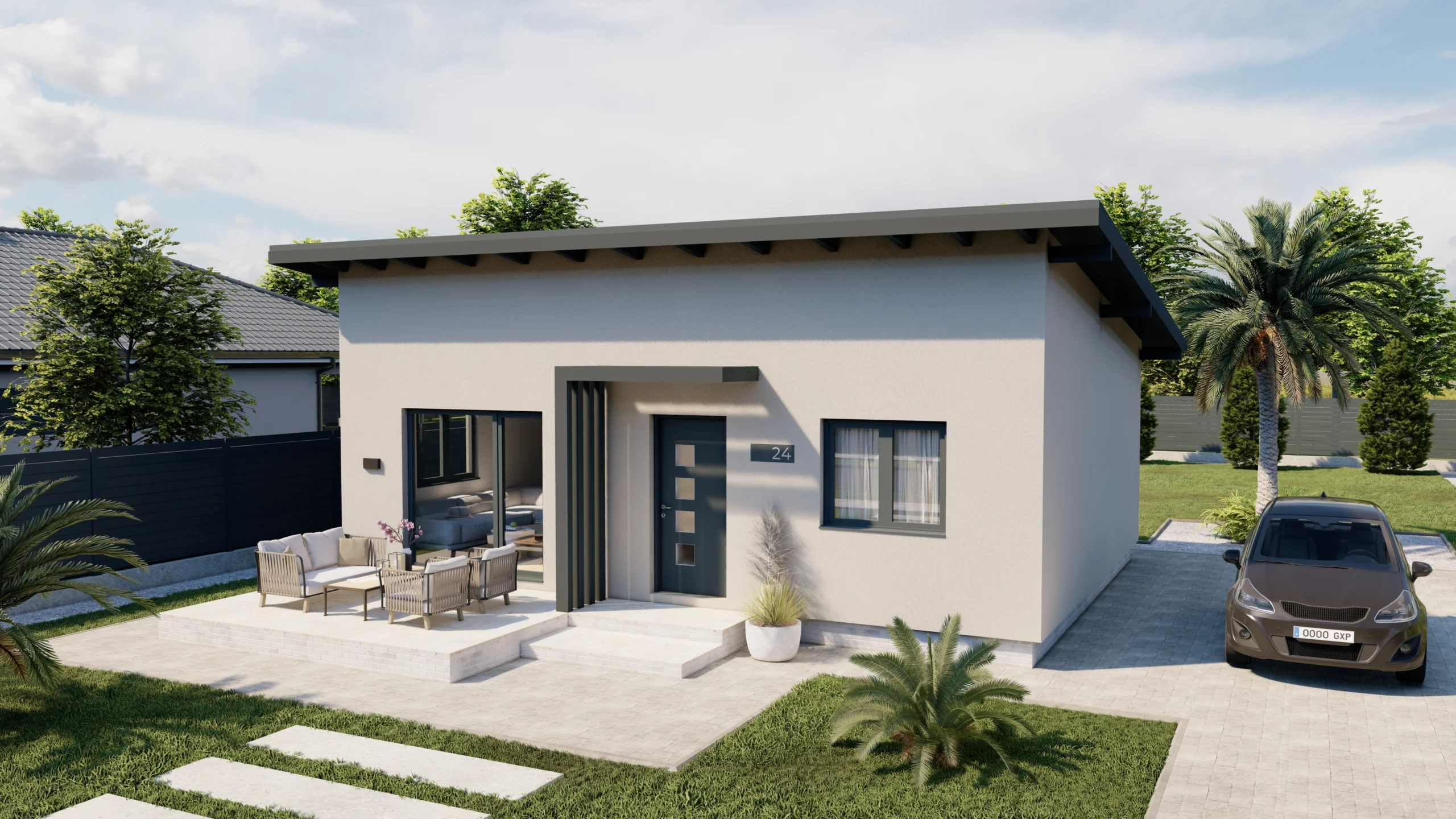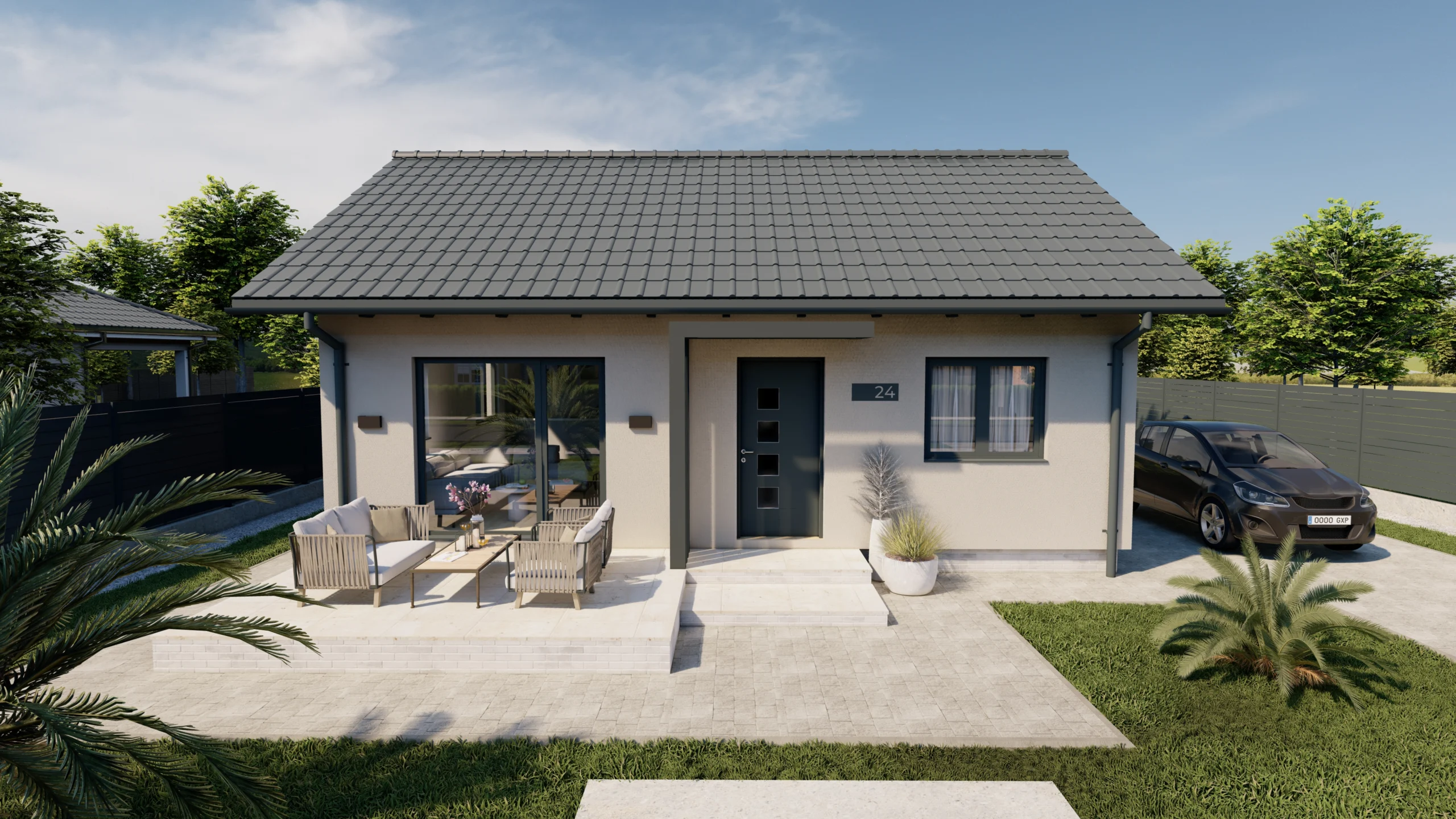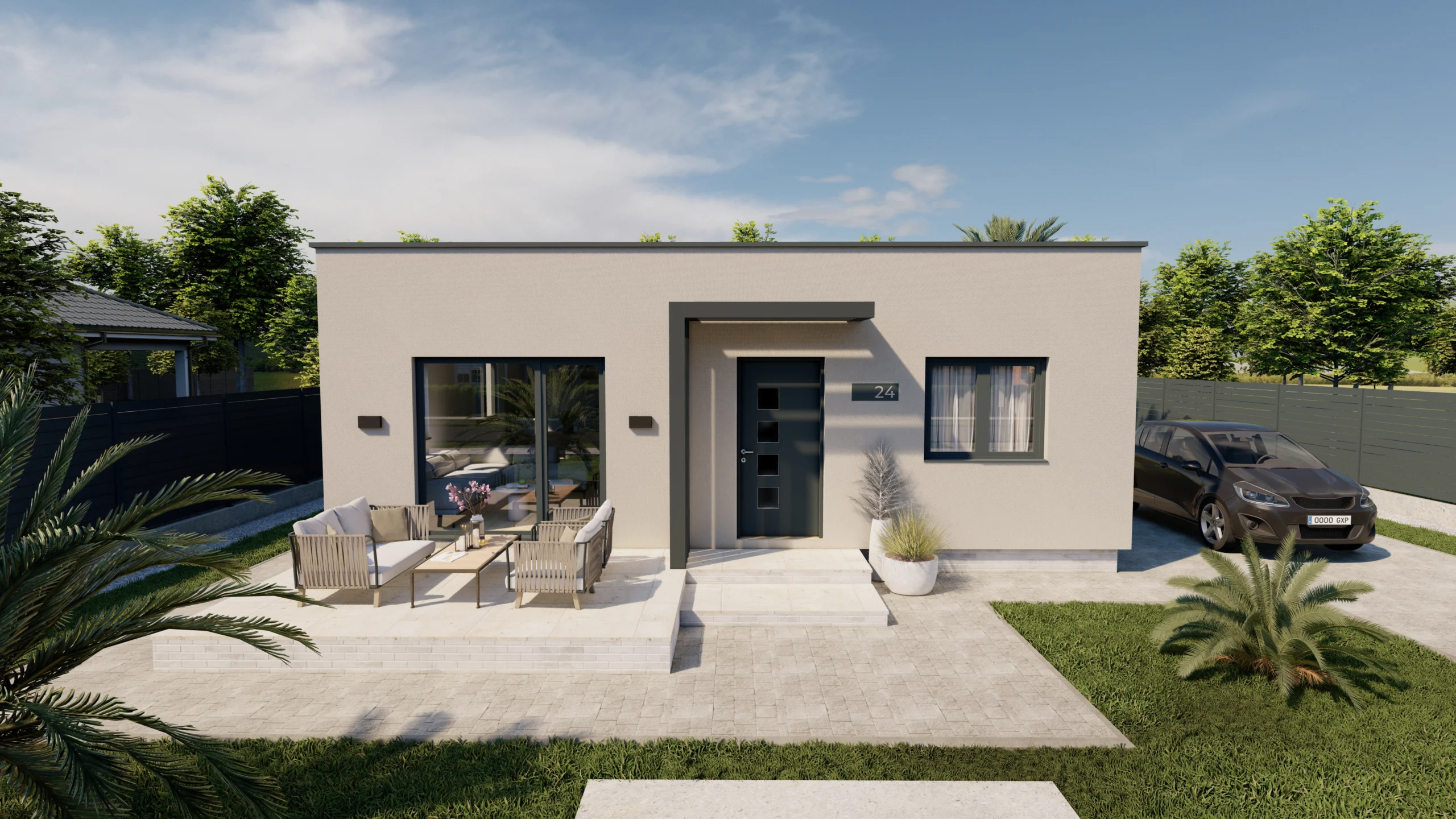 Haus Lea steht für modernes, reduziertes Wohnen mit Herz. Auf einer Ebene bietet dieser charmante Bungalow alles, was man braucht – durchdachte Raumaufteilung, helle Wohnbereiche und ein harmonisches Wohngefühl. Das klassische Walmdach verleiht dem Haus eine zeitlose Eleganz, während die kleine Terrasse ein perfekter Ort für sonnige Frühstücke oder entspannte Abende ist. Gerade für Menschen, die es gerne übersichtlich und gemütlich mögen, ist „Lea“ der ideale Rückzugsort. Ob im Grünen oder am Stadtrand – hier lässt sich das Leben entschleunigt genießen. Ein Ort zum Ankommen, Wohlfühlen und Bleiben.
