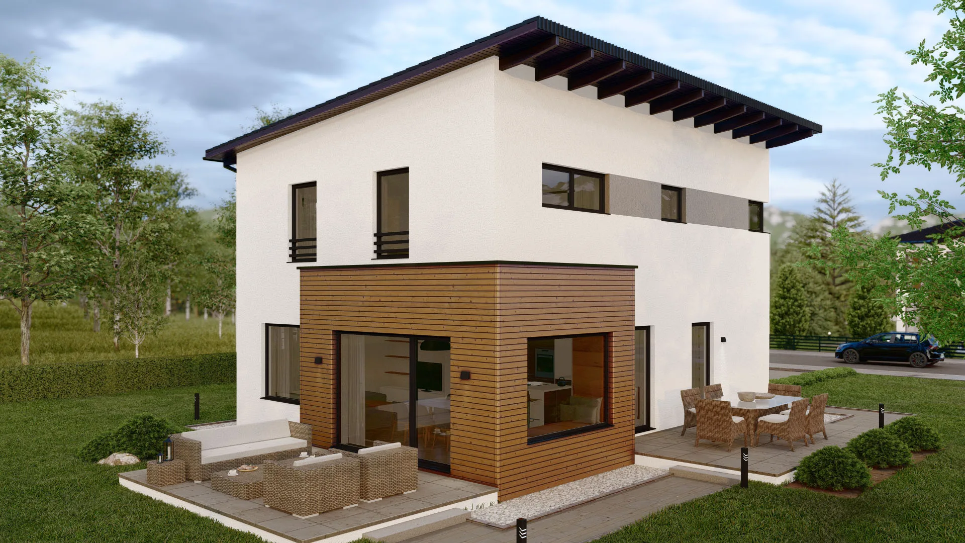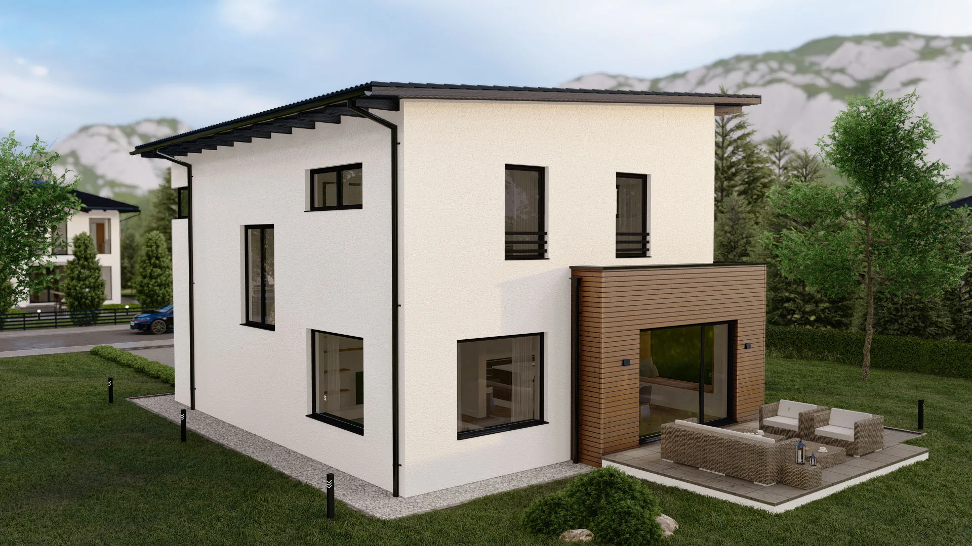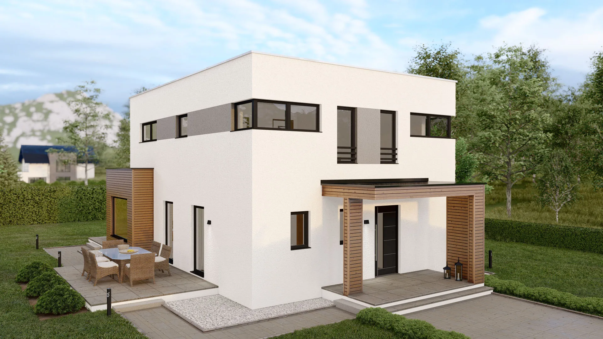 Modernes Fertighaus mit zeitgemäßer Architektur und großen Fensterfronten von BAUTENT