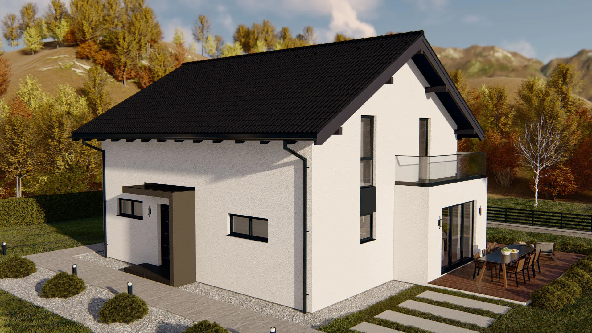 Harmonisches Familienhaus mit 209,6 m², 2 Etagen, klassischem Satteldach (30° Neigung) und kleiner Terrasse (2,56 m²) – ideal für Familien, die Komfort und Stil suchen.