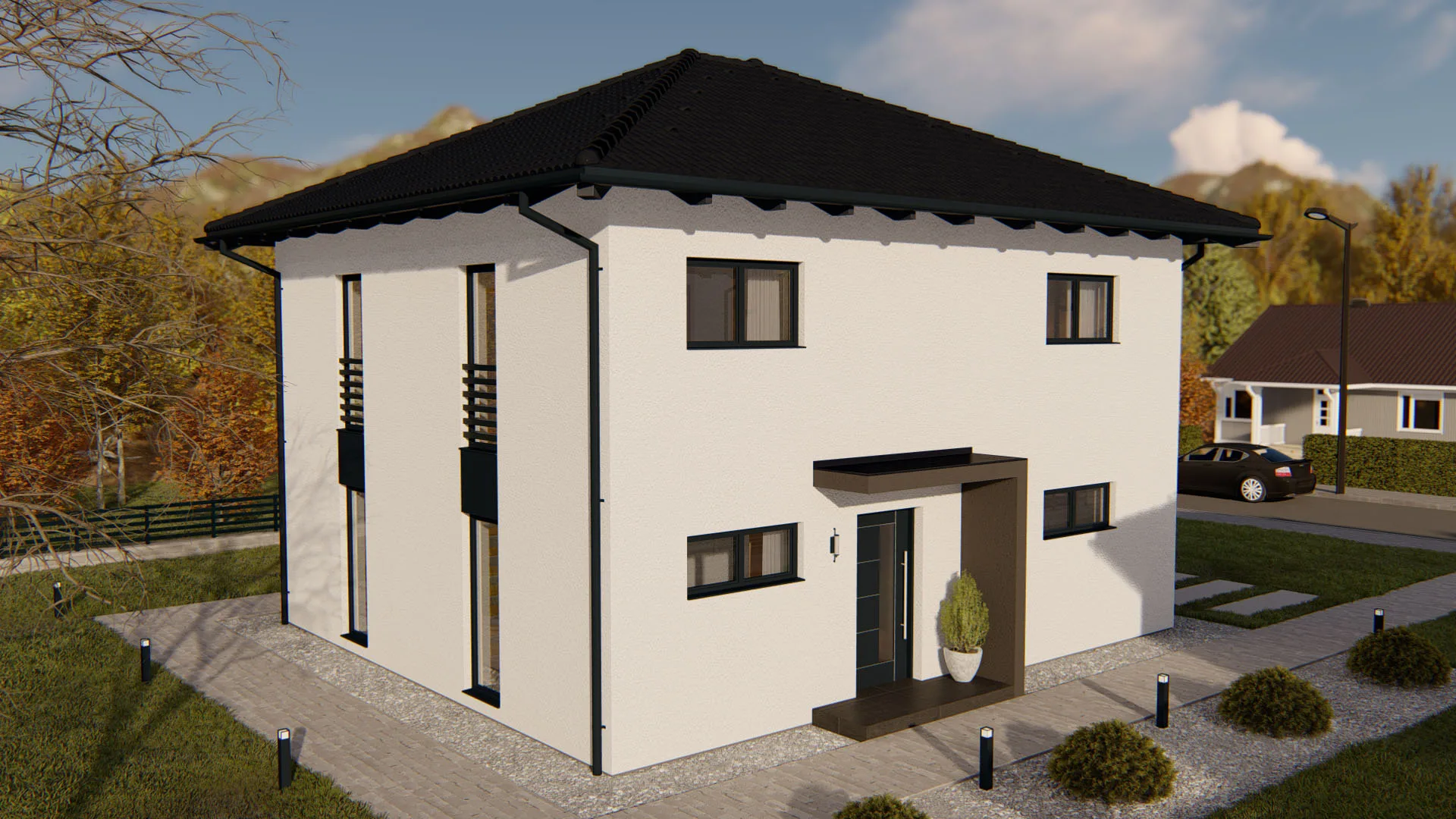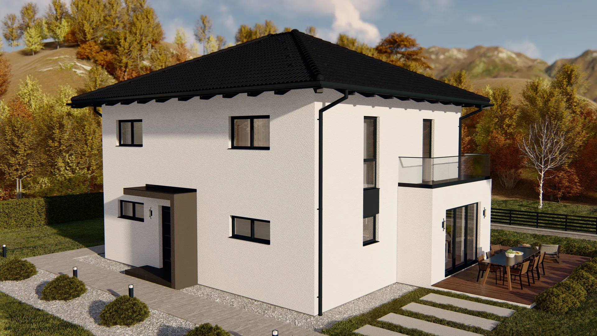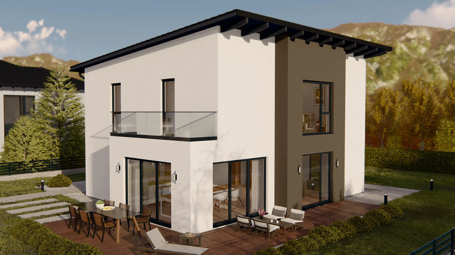 Modernes Fertighaus mit zeitgemäßer Architektur und großen Fenstern - Beispiel für hochwertige Fertigbauweise