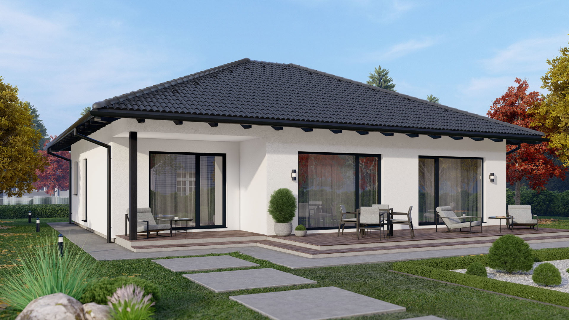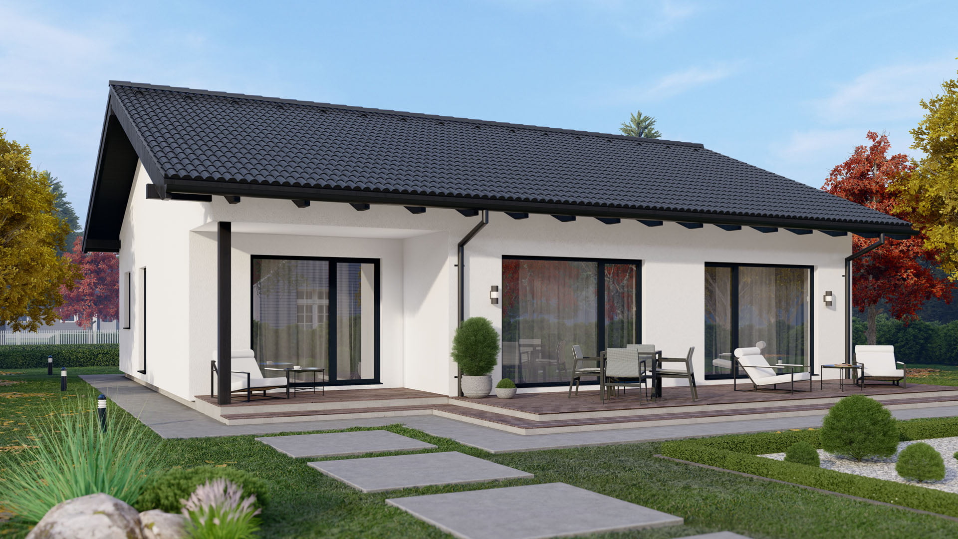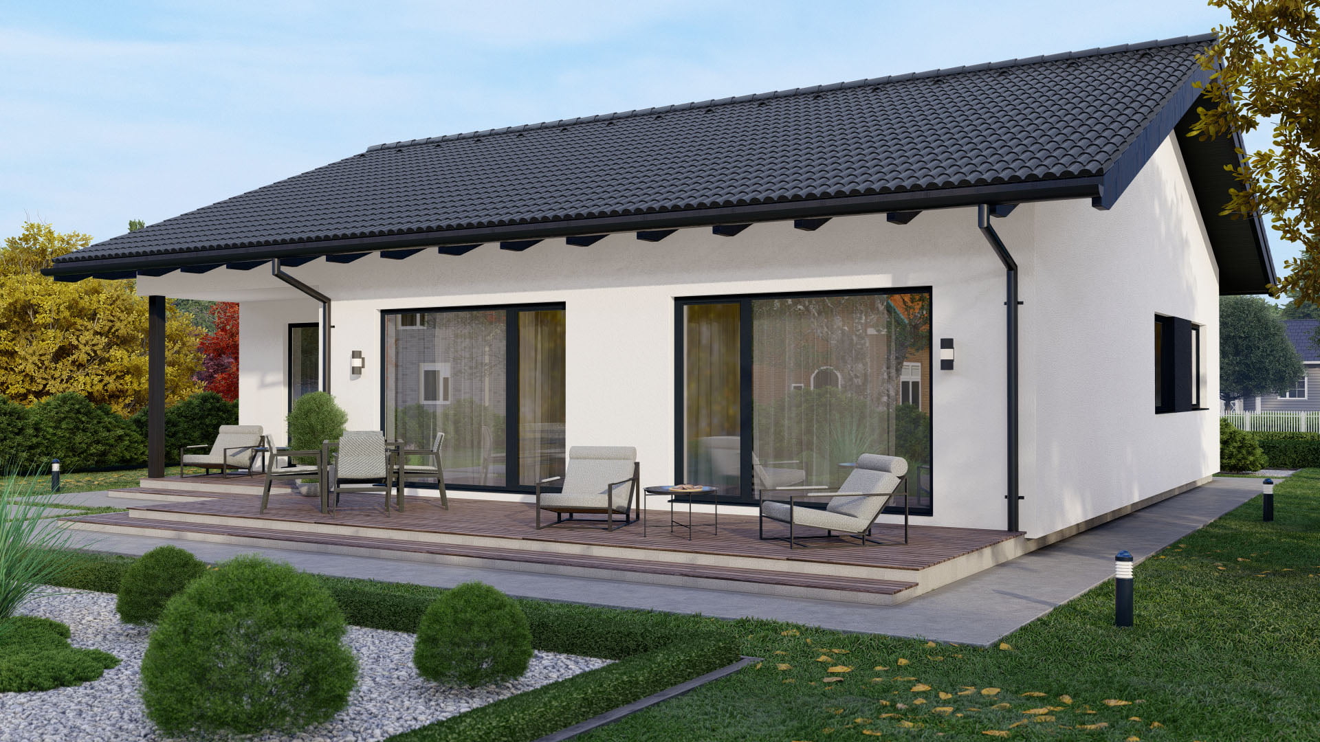 Stilvoller Bungalow mit 139,87 m², 1,5 Etagen und Satteldach (22° Neigung) – ideal für Familien, die klassische Form mit moderner Funktion verbinden möchten.